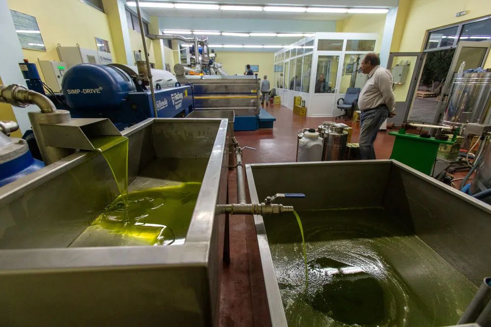 ↑希臘伯羅奔尼撒半島麥西尼亞一家橄欖油廠的橄欖油生產線。